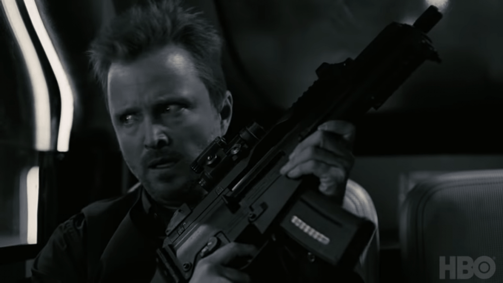 Catching back up with Dolores (Evan Rachel Wood), Caleb (Aaron Paul) and Liam Dempsey Jr. (John Gallagher Jr.), they’re on the run from Serac’s forces who are no doubt after Liam. From some of what Liam says to Caleb in these early scenes, it appears there may be more to Caleb’s past we don’t know about yet. Liam injects Caleb with the drug that got mentioned in the last episode, ‘genre’, which sends him into a massive trip that lasts the majority of the episode. At first, it turns what Caleb is seeing into a 50s black and white noir film fit with an orchestral playlist.